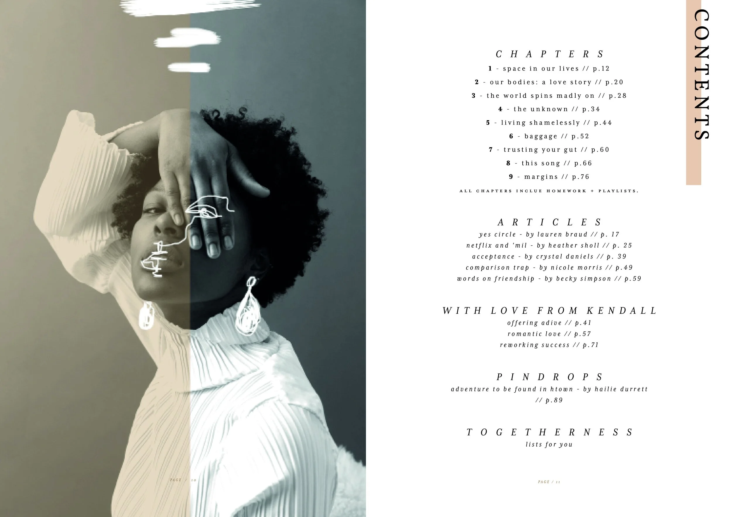 i have had the pleasure of designing the most recent annual books for the white buffalo project membership. these lovely books were created for each member, for personal use and during their ‘herd’ meetings throughout the year. each hardbound book design included over a hundred pages of custom artwork, typography, photography, poetry and playlists. the minimalist cover art allows for design cohesion with future seasons. each book consists of nine chapters, member articles and feature pages, and includes journaling space. i drew inspiration for the design from an artistic feminine aesthetic, using warm neutral tones, and my own experiences as a member of the organization.